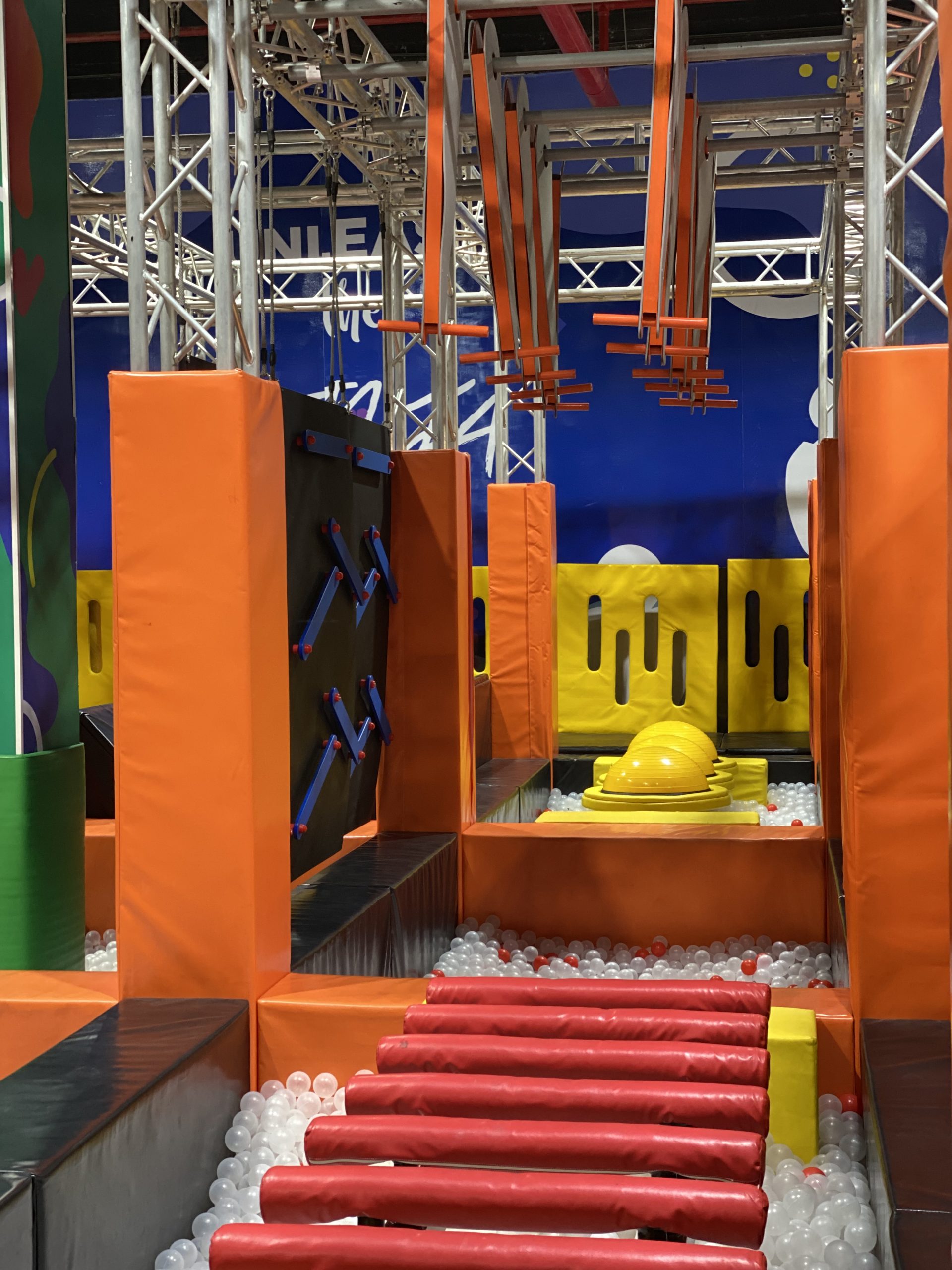 Large space for kids filled with mazes and ball pit with ball cannons and the tallest slide