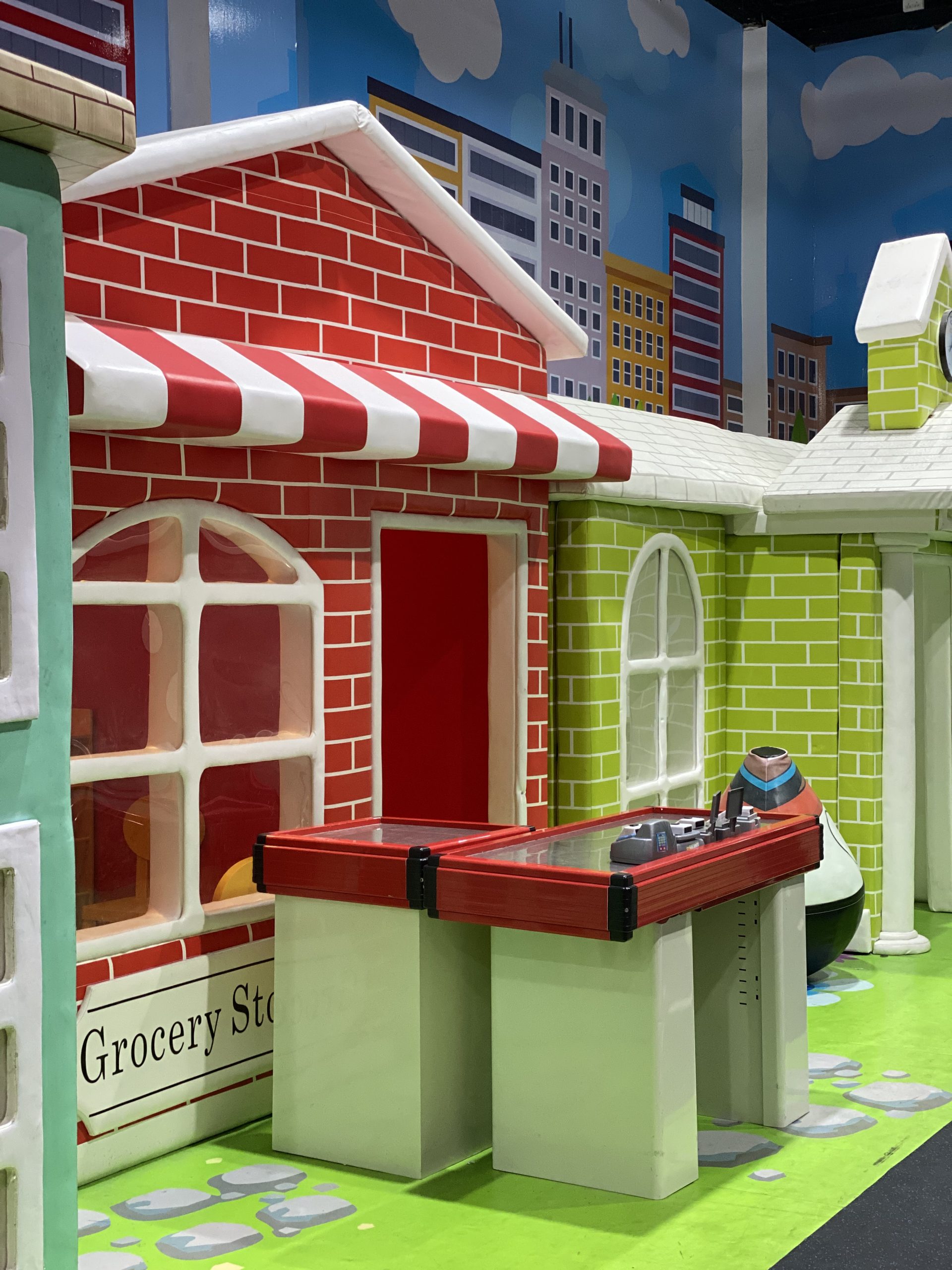 Indoor city with a gas station a hospital, roads, rooms for kids to play in